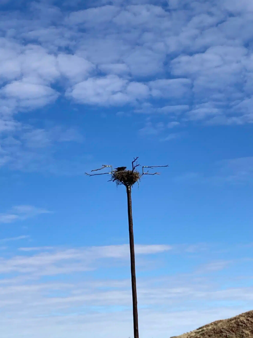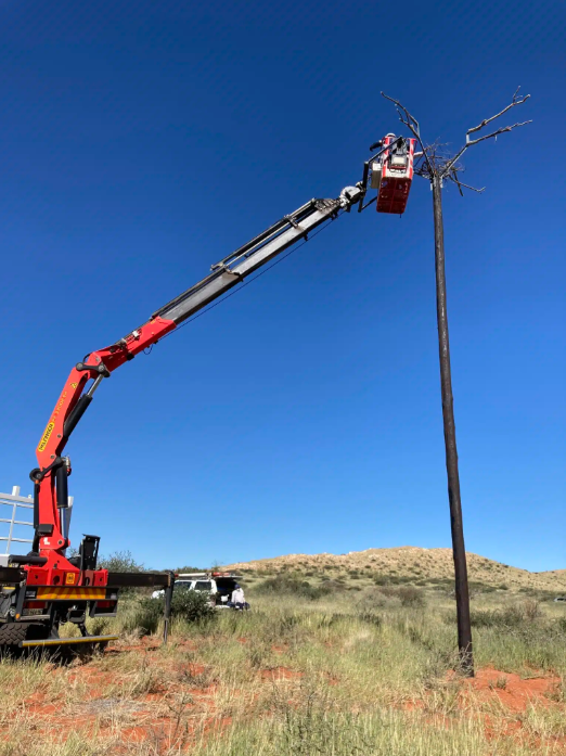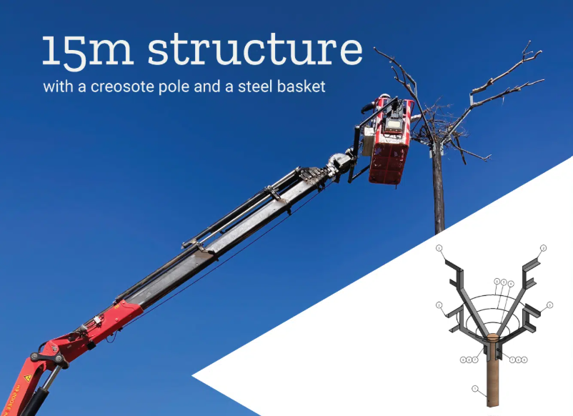 Based on the design developed by the Zutari engineering team, two 15m high nesting structures were built. The structures comprise a creosote pole and a steel ‘basket’ with perching space at the top (depicted below). In April 2022, Eskom took down the two existing nests from the pylons with guidance from EWT and relocated them to the new position. A rudimentary nest was rebuilt on the structure to lure the birds into continuing further nest construction.