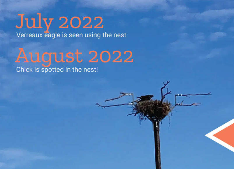 In July 2022, the Verreaux Eagle was spotted using the new nesting structure, and in August 2022, a chick was seen inside the nest. To the team’s knowledge, this is the first ‘known’ successful Verreaux’s Eagle nest relocation in South Africa, and monitoring the nest and the chick will be ongoing. The Martial Eagle is not expected to breed this season, and monitoring its new nest location will continue.